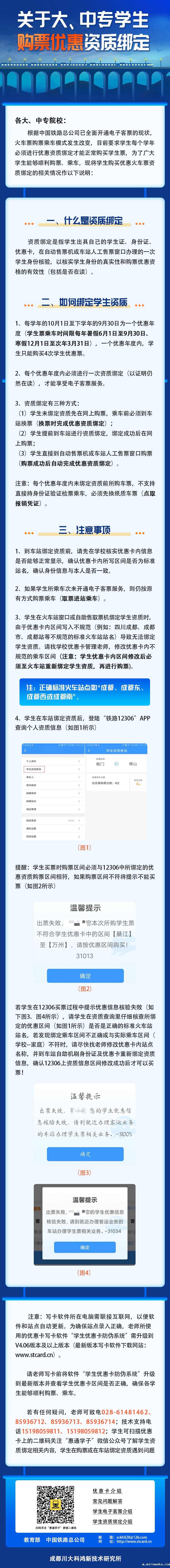 3.学生在线上优惠资质核验过程中,遇到学籍电子注册相关问题请咨询学信网客服或者联系研究生院,其他问题请咨询12306客服。线下优惠资质核验过程中遇到问题可在“惠通学子”公众号内咨询。